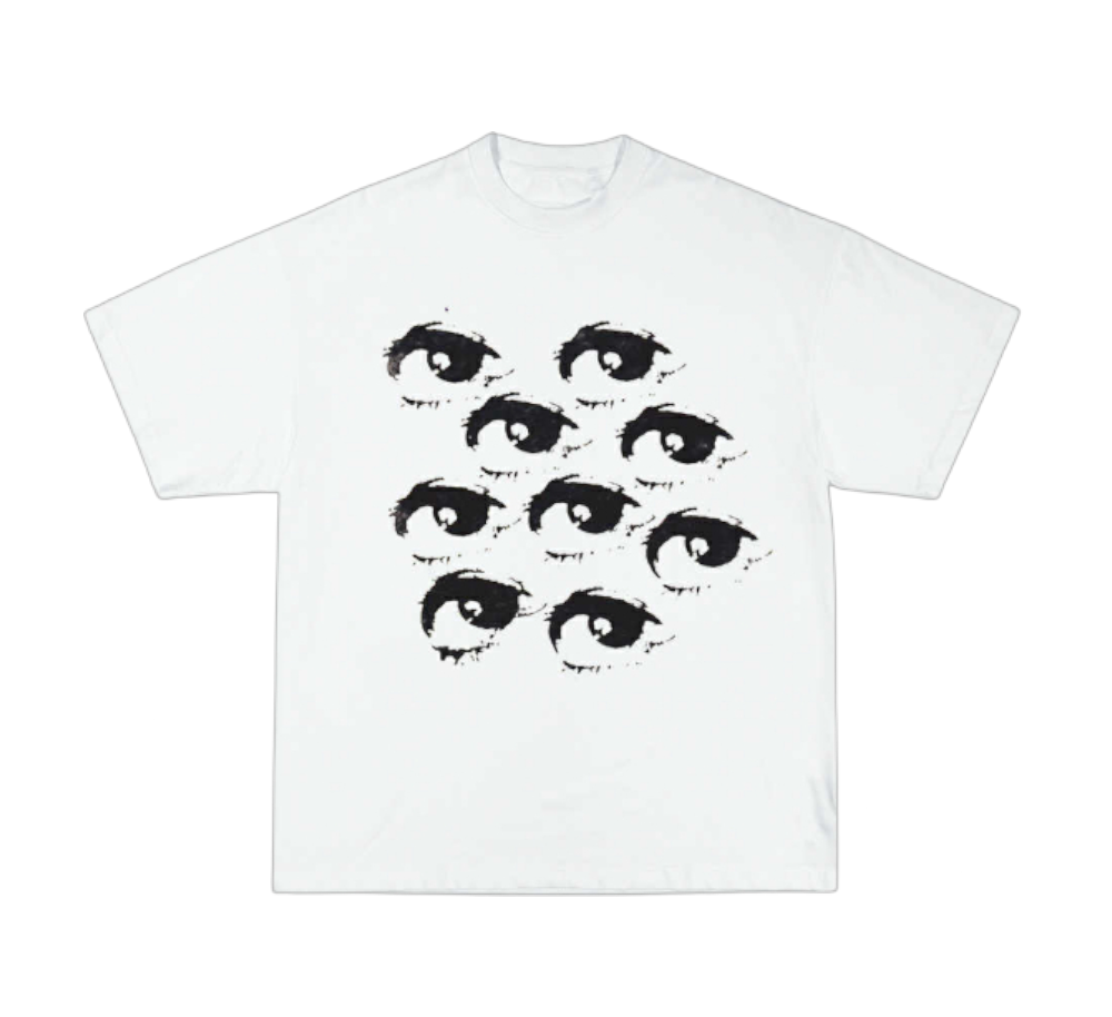 The Evil Eye Tee features a striking grid of nine black eyes printed across the chest, symbolizing awareness and connection. Crafted in crisp white cotton, it’s designed for everyday comfort while making a bold visual statement.
